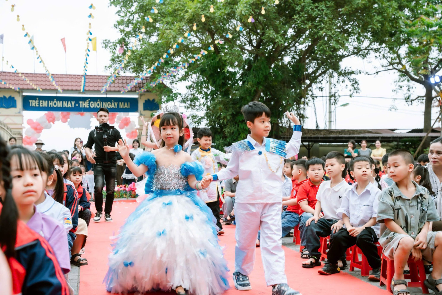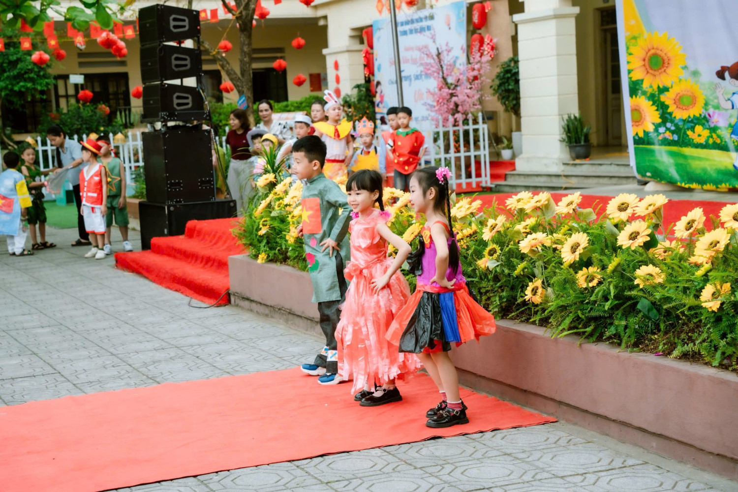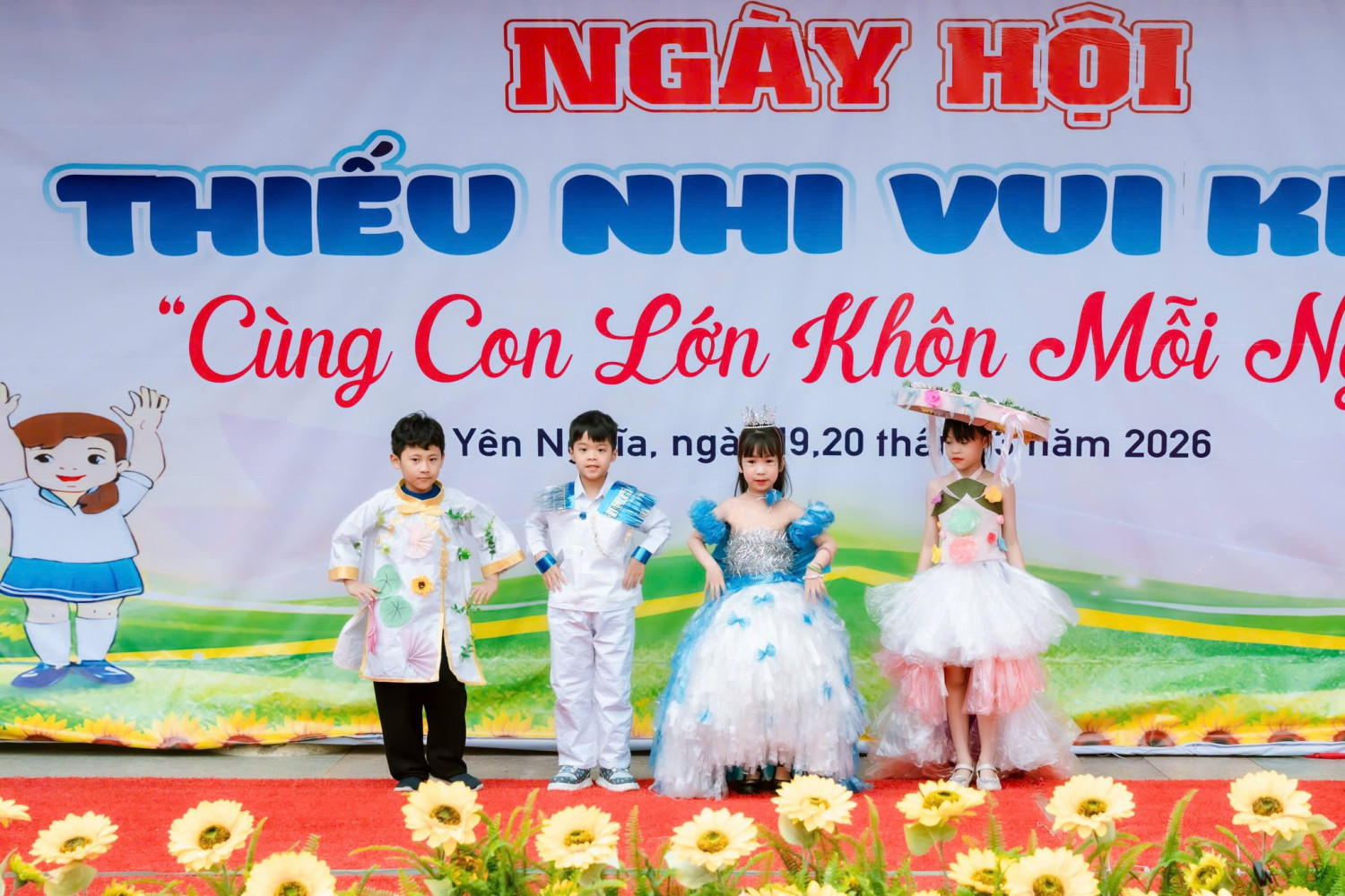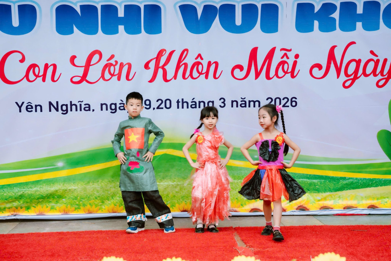 Mang đến những gam màu đầu tiên cho bức tranh ngày hội là phần thi Trình diễn thời trang tái chế của các bạn nhỏ khối 1, 2, 3. Dưới đôi bàn tay khéo léo và sự sáng tạo đầy ngộ nghĩnh, những bộ trang phục độc đáo đã dần hiện ra, mang theo cả sắc màu tuổi thơ và thông điệp về bảo vệ môi trường. Mỗi bước chân nhỏ xinh, mỗi nụ cười e ấp mà rạng ngời của các con không chỉ làm sáng bừng sân khấu, mà còn khiến người xem cảm nhận rõ nét sự tự tin và vẻ đẹp trong trẻo của tuổi học trò.
