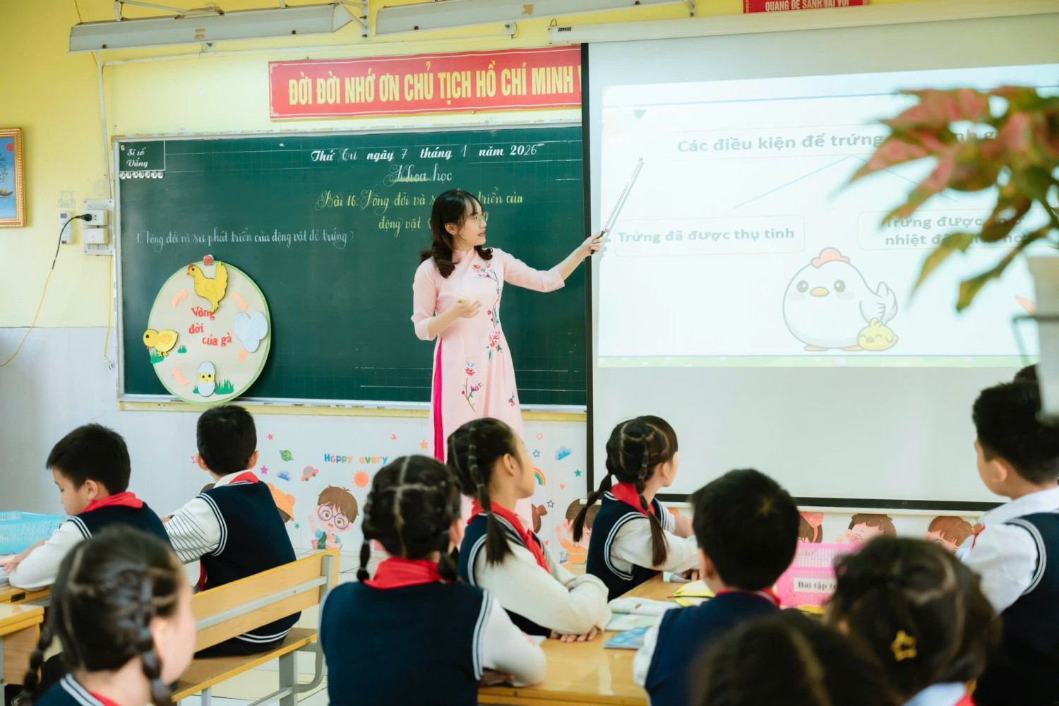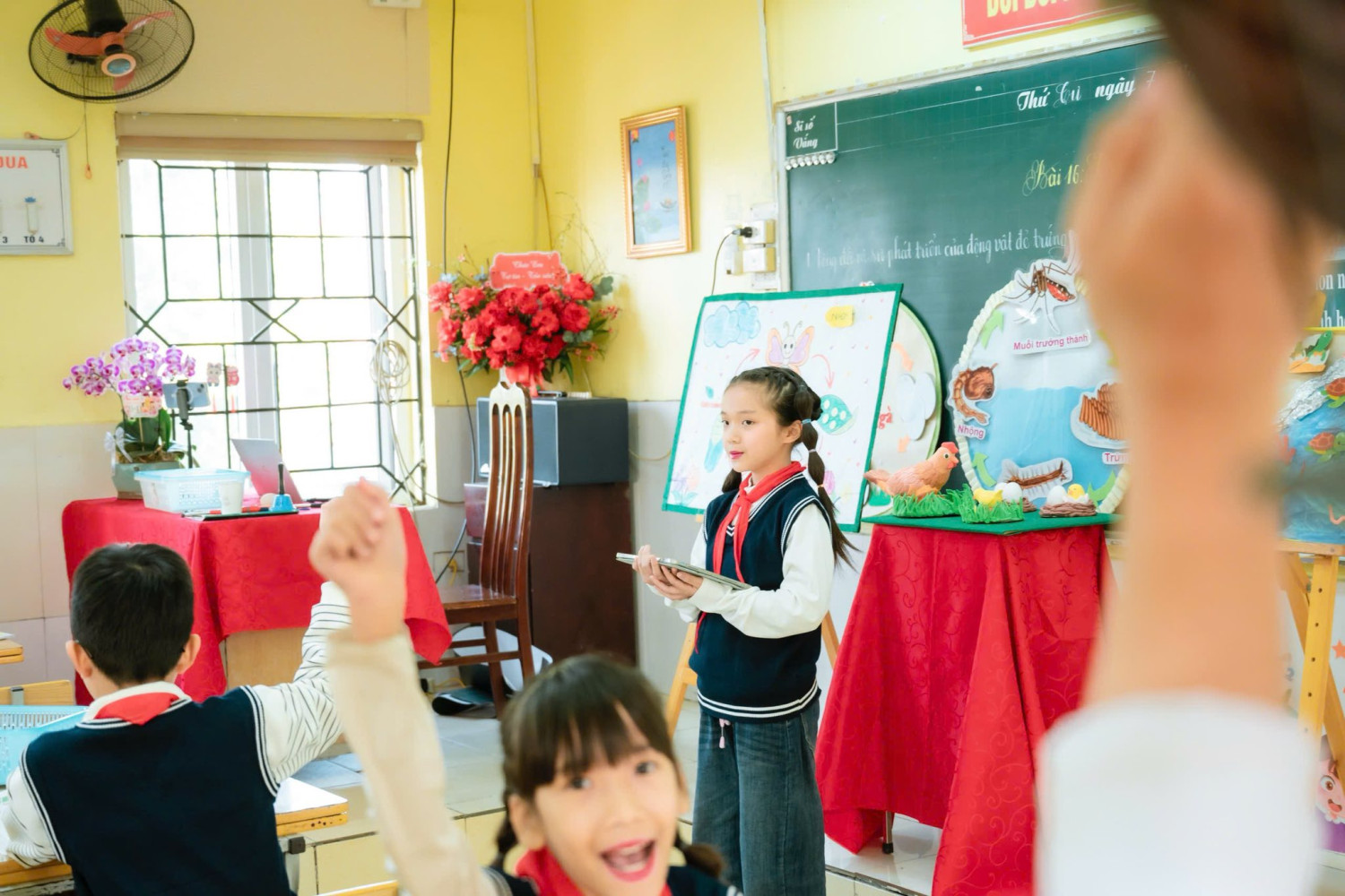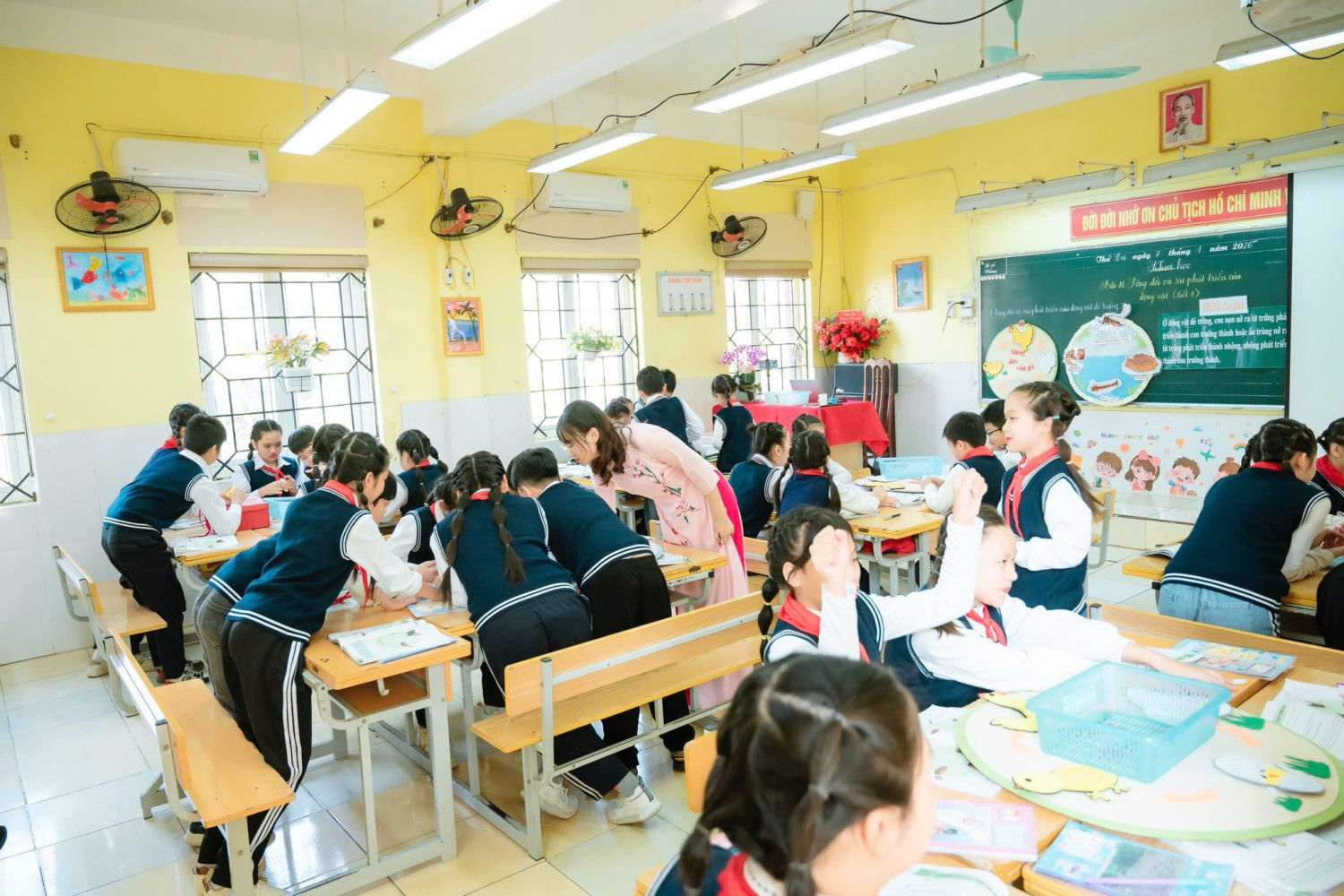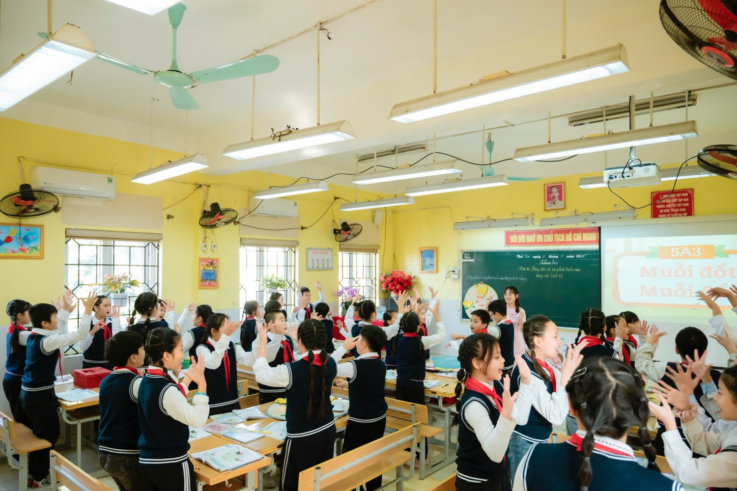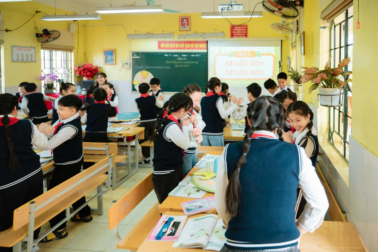 Không dừng lại ở kiến thức trong sách giáo khoa, cô giáo đã dẫn dắt học sinh khám phá sâu hơn, mở rộng hiểu biết về các yếu tố giúp tăng tỉ lệ nở của trứng, giúp bài học gắn liền với thực tiễn đời sống và sản xuất. Sự chuyển tiếp giữa các nội dung được kết nối linh hoạt, tự nhiêm thông qua trò chơi “Muỗi đốt – muỗi đốt”, tạo không khí học tập sôi nổi