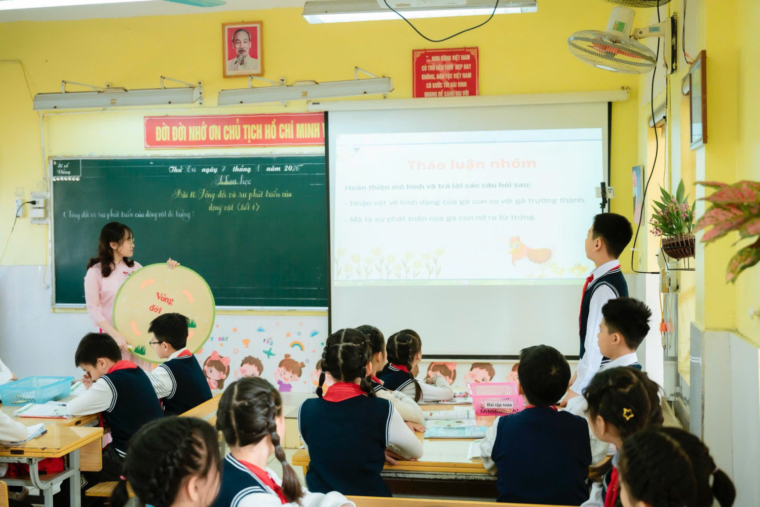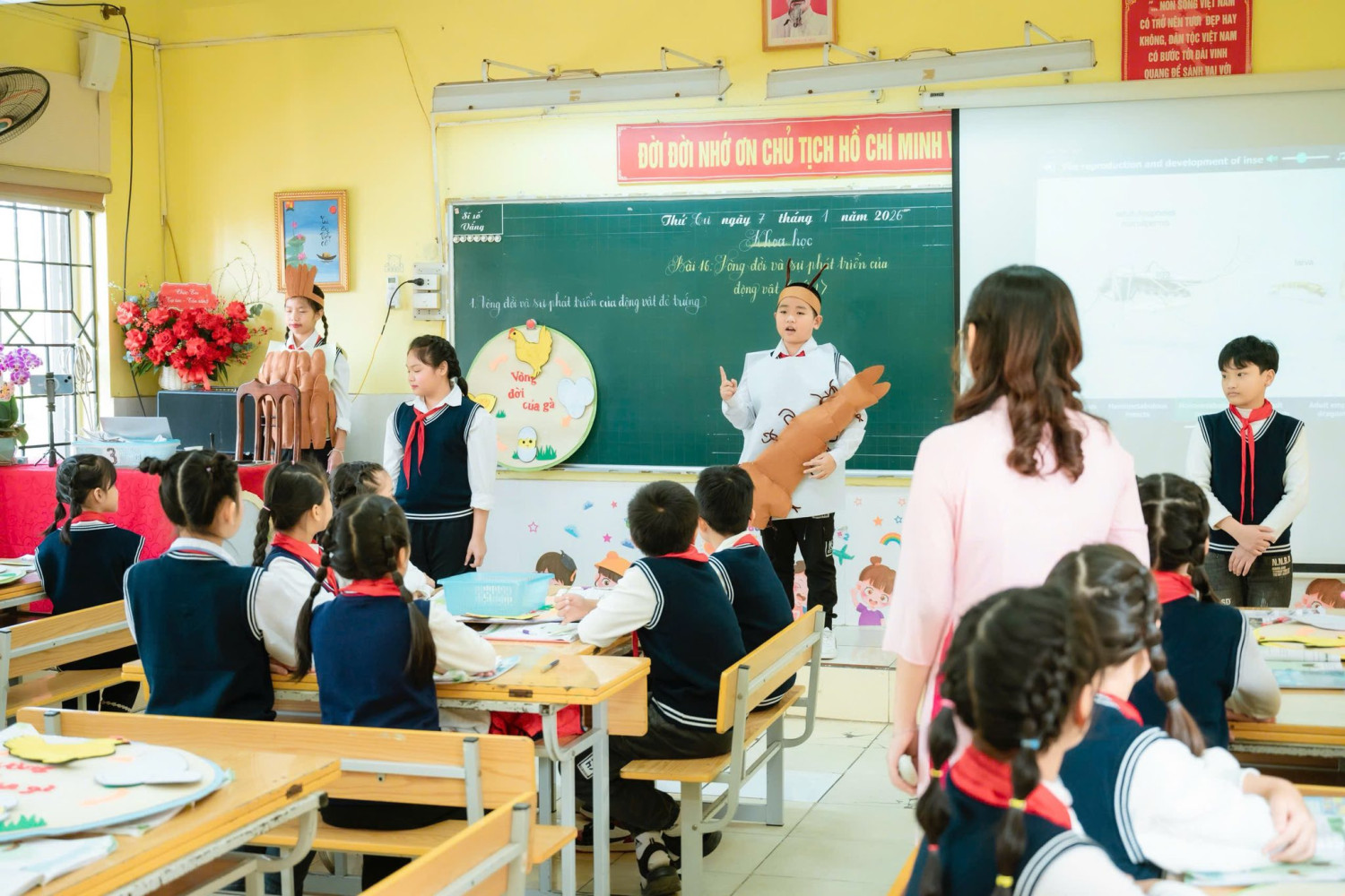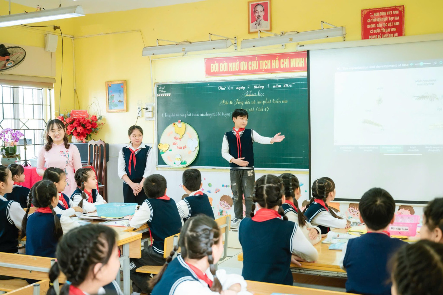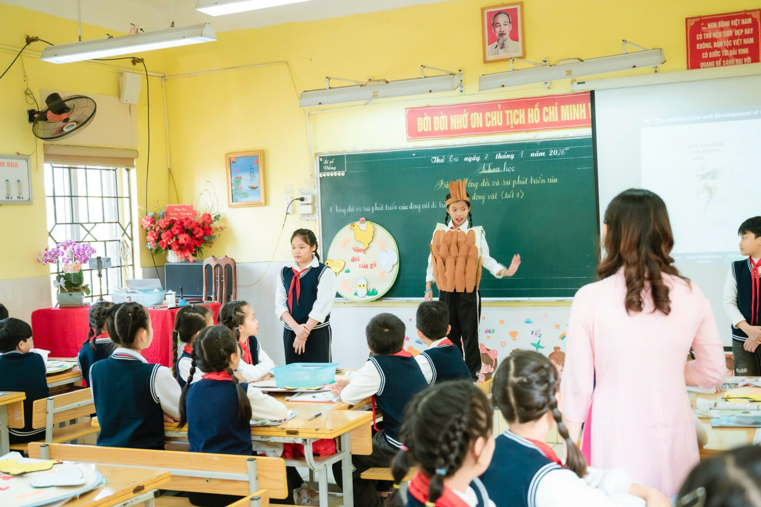 Tiết học mở đầu bằng một câu chuyện cảm động, nhẹ nhàng nhưng sâu lắng, đánh thức trong học sinh niềm yêu thương và niềm khát khao khám phá thế giới tự nhiên. Từ đó, các con bước vào hành trình tìm hiểu vòng đời của gà thông qua mô hình trực quan kết hợp phần thuyết trình song ngữ đầy tự tin và ấn tượng của hai bạn Bảo Ngọc và Thảo Vy, để lại nhiều cảm xúc đẹp cho người dự giờ.