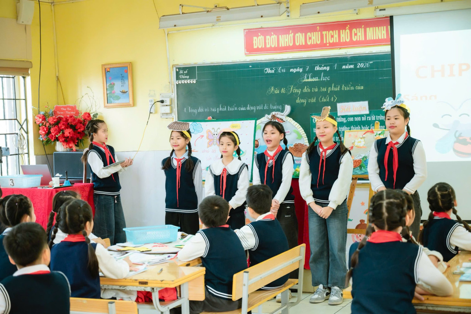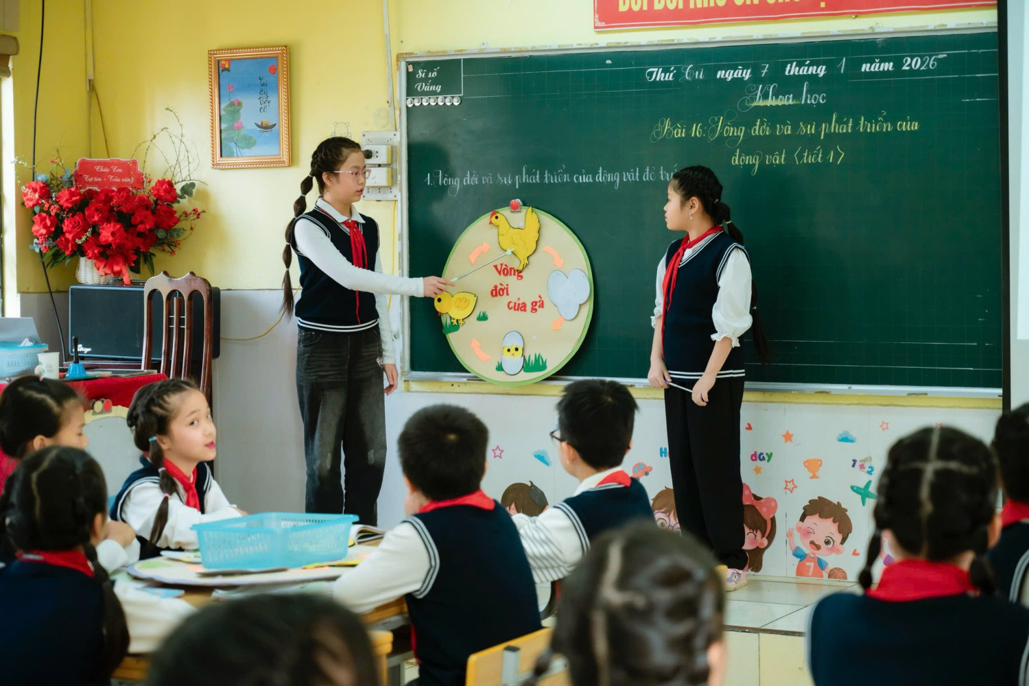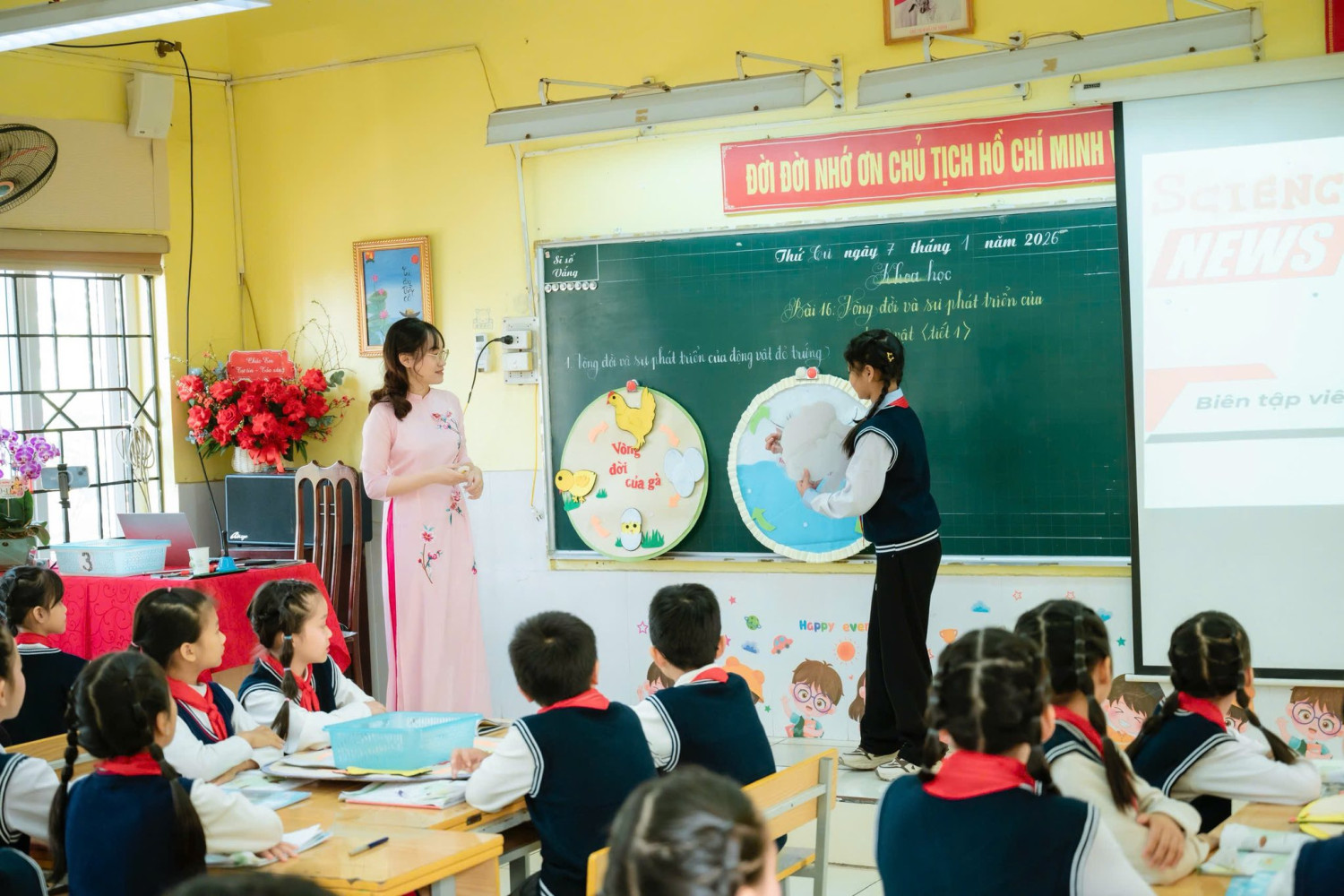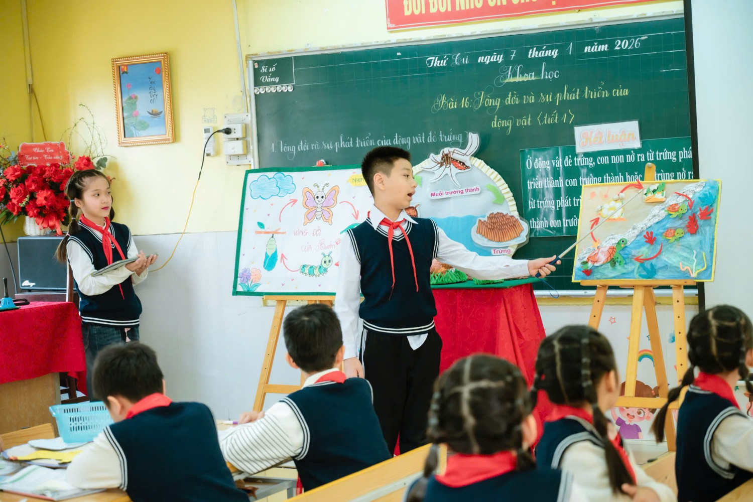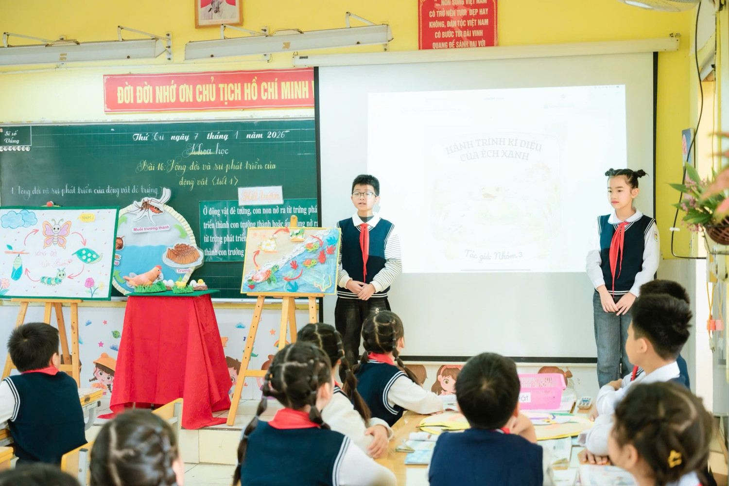 Tiết học mở đầu bằng một câu chuyện cảm động, nhẹ nhàng nhưng sâu lắng, đánh thức trong học sinh niềm yêu thương và niềm khát khao khám phá thế giới tự nhiên. Từ đó, các con bước vào hành trình tìm hiểu vòng đời của gà thông qua mô hình trực quan kết hợp phần thuyết trình song ngữ đầy tự tin và ấn tượng của hai bạn Bảo Ngọc và Thảo Vy, để lại nhiều cảm xúc đẹp cho người dự giờ.