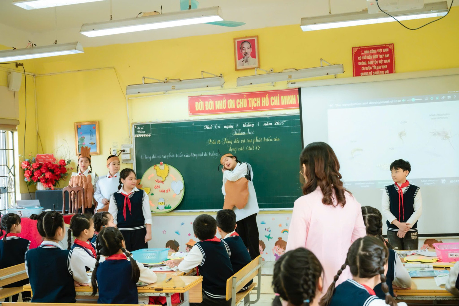 Từ đó, học sinh tiếp tục tìm hiểu vòng đời của muỗi bằng màn diễn kịch sáng tạo, nơi các em được hóa thân, thể hiện kiến thức một cách sinh động, tự tin và đầy cảm xúc – một minh chứng rõ nét cho việc học sinh thực sự là chủ thể của giờ học.